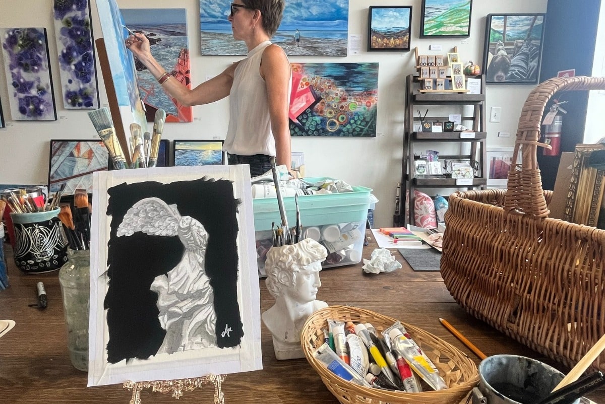 Painter and teaching artist Kelly Lucarelli creates expressive artwork inspired by light, nature, and a sense of calm. Her studio welcomes visitors, students, and collectors into a creative, encouraging environment.
